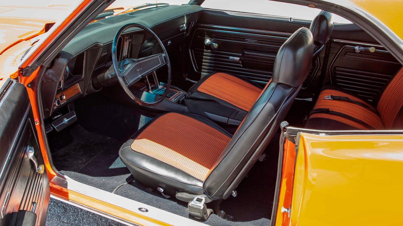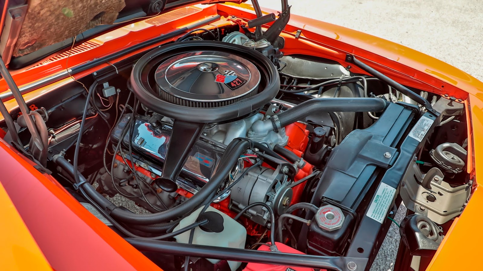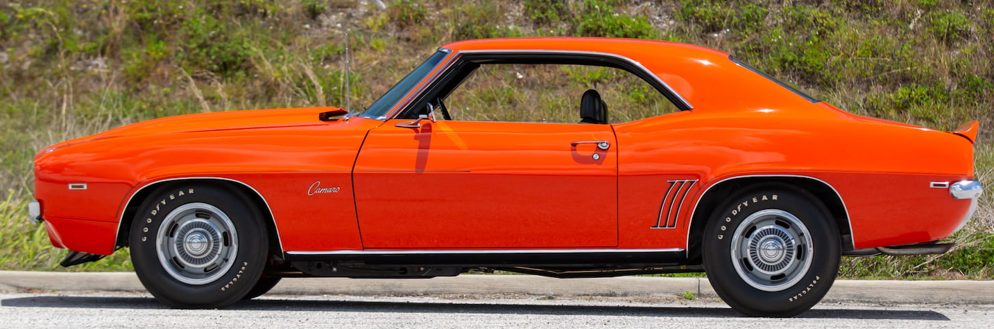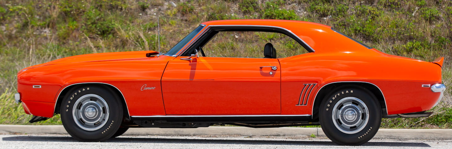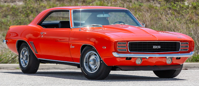 ![]() | 1 of 58 COPO Camaros produced with Rally Sport option in 1969. 29,323 miles. 427/425 HP Turbo Jet V-8 engine. Automatic transmission. Hugger Orange exterior. Aluminum intake manifold and bell housing. ZL-2 ducted hood. Holley 4-barrel carburetor. Harrison HD core radiator. Front disc brakes. 12-bolt Positraction rear end. |