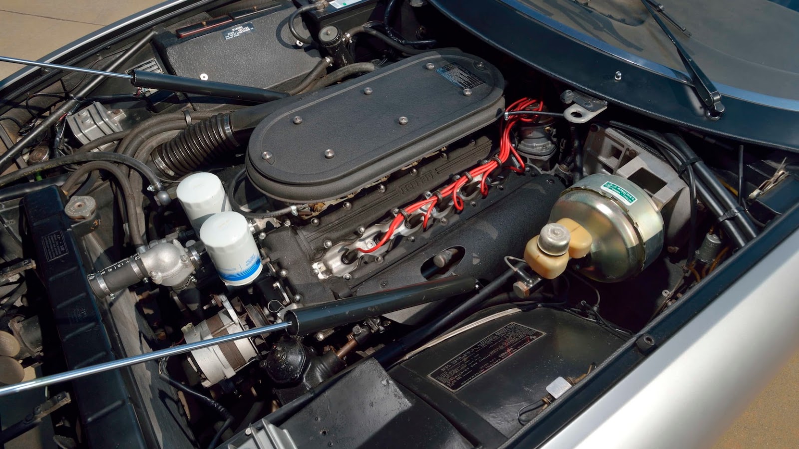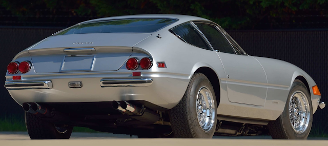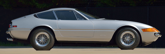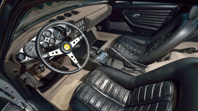 ![]() | 1 of 1,383 produced. Completed in October 1972. U.S. spec car. Matching numbers drivetrain. 4.4L DOHC front-mounted V-12 engine. Weber carburetors. Ansa exhaust. Gated 5-speed manual gearbox. 4-wheel power disc brakes. Correct Argento Metallizzato over Nero color combination. Leather upholstery. Air conditioning. Power windows. AM/FM radio. Borrani chrome wire wheels. A total of 1,406 vehicles were built over the life of the model. This figure includes 156 UK right-hand-drive coupés, 122 factory-made spyders, and 15 competition cars. |
