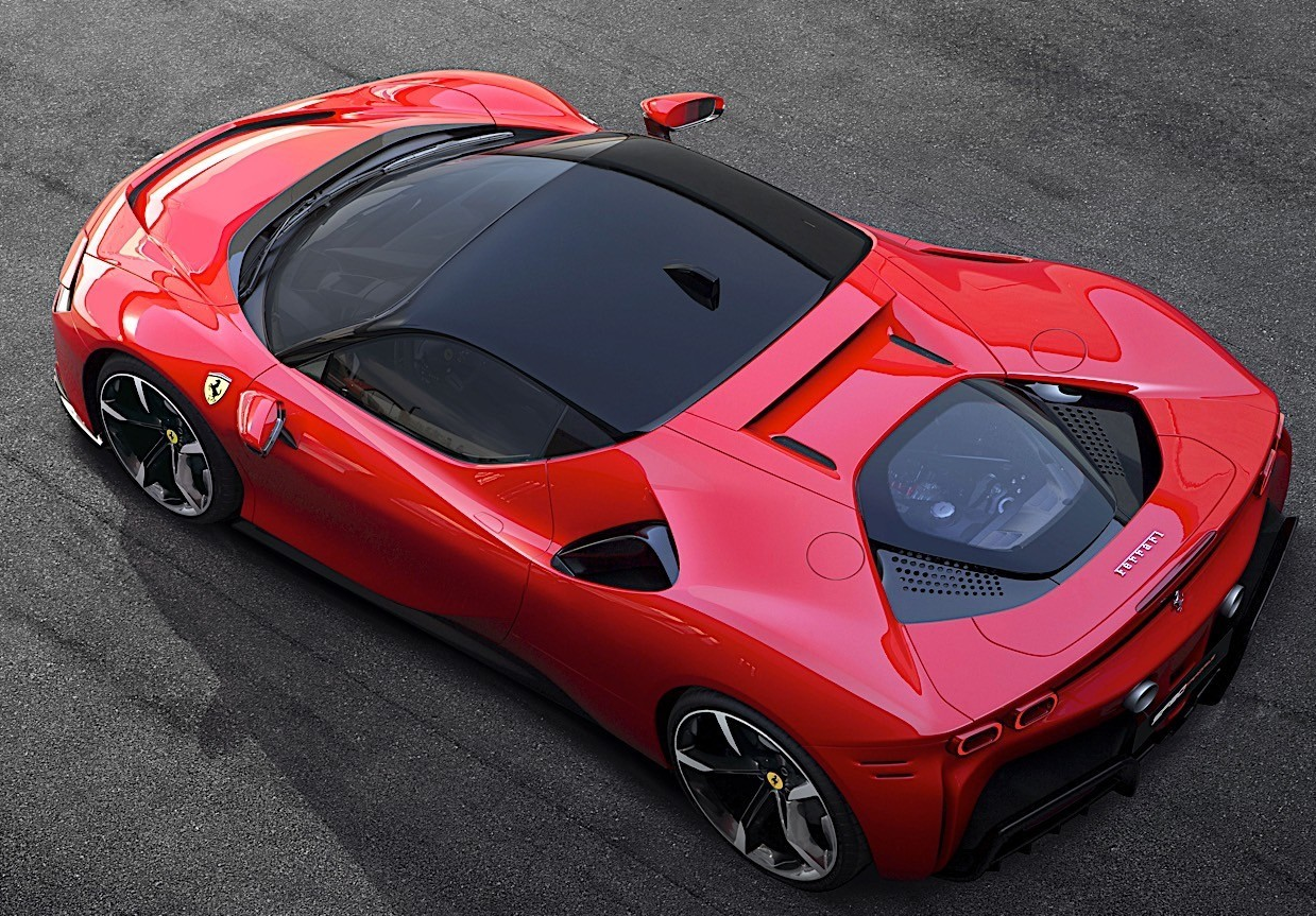 Thanks to AWD and the hybrid tech, the SF90 makes 0–62mph in 2.5 seconds and 0–124mph in 6.7. It tops out at a blistering 211mph. Aerodynamic features help the SF90 Stradale stick to the pavement with up to 860 pounds of downforce. The car comes with a new 8-speed dual clutch transmission. The transmission does not have a reverse gear.