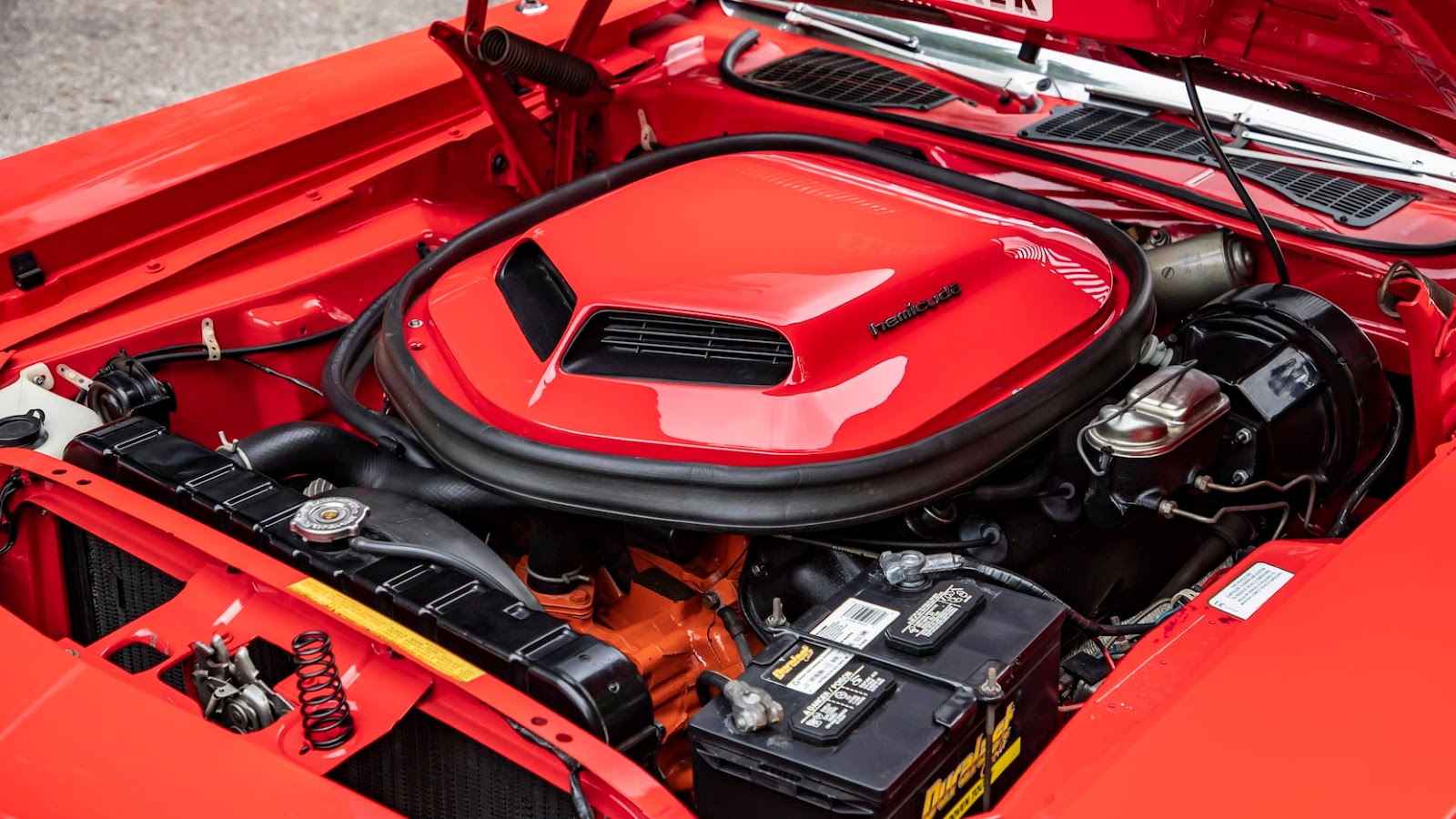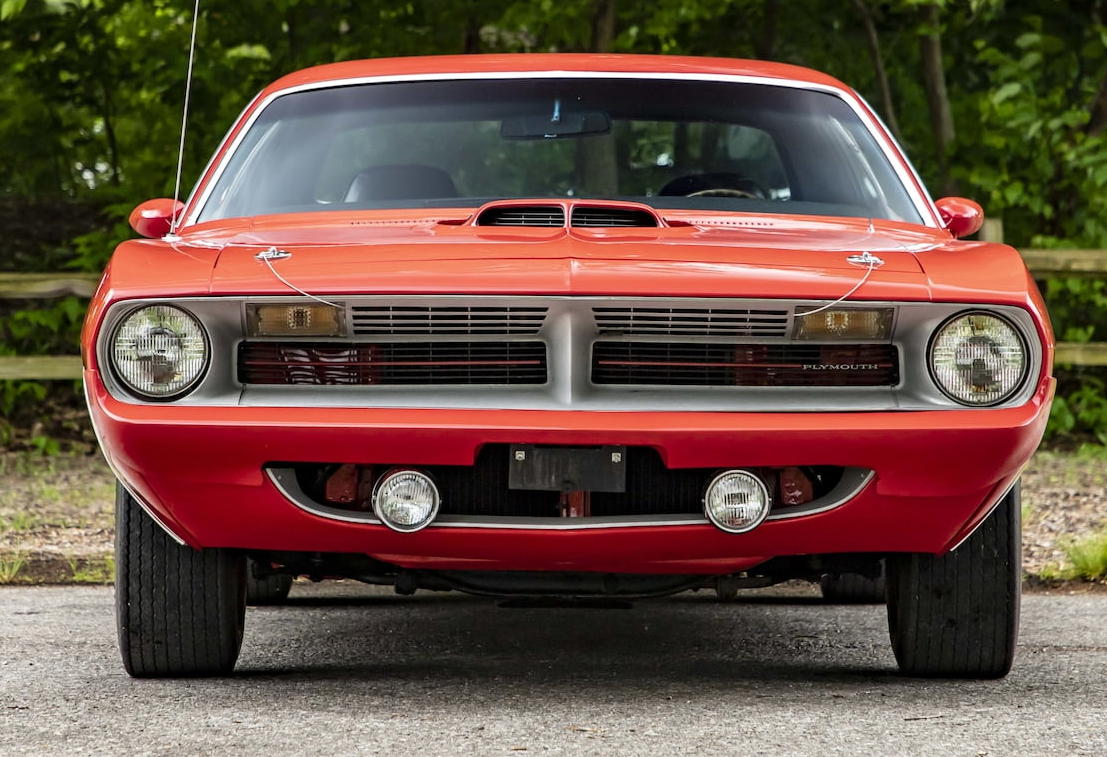 | A 426 Hemi engine instantly made the regular production Hemi ‘Cuda the King Kong of pony cars. With an output of 425 hp, it was matched only by Chevy’s COPO Camaro 427. For the money, a significant $900, you got the 425-hp hemispherical V-8 engine fed by two four-barrel carburetors on an aluminum intake manifold. The Hemi was backed by either the TorqueFlite three-speed automatic or the A-833 four-speed manual. | ![]() |