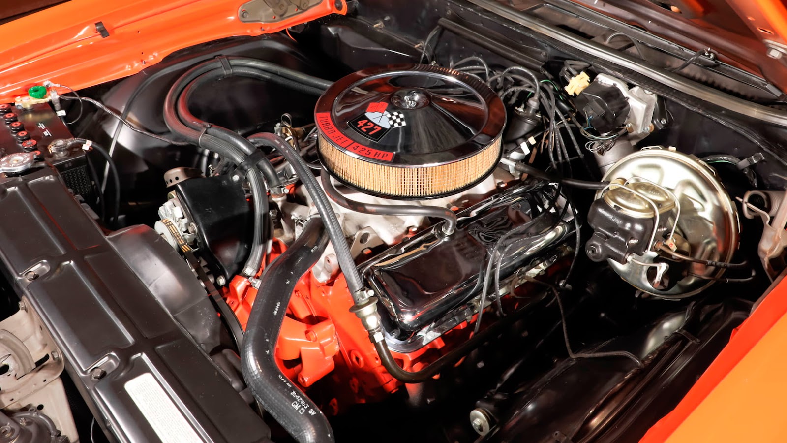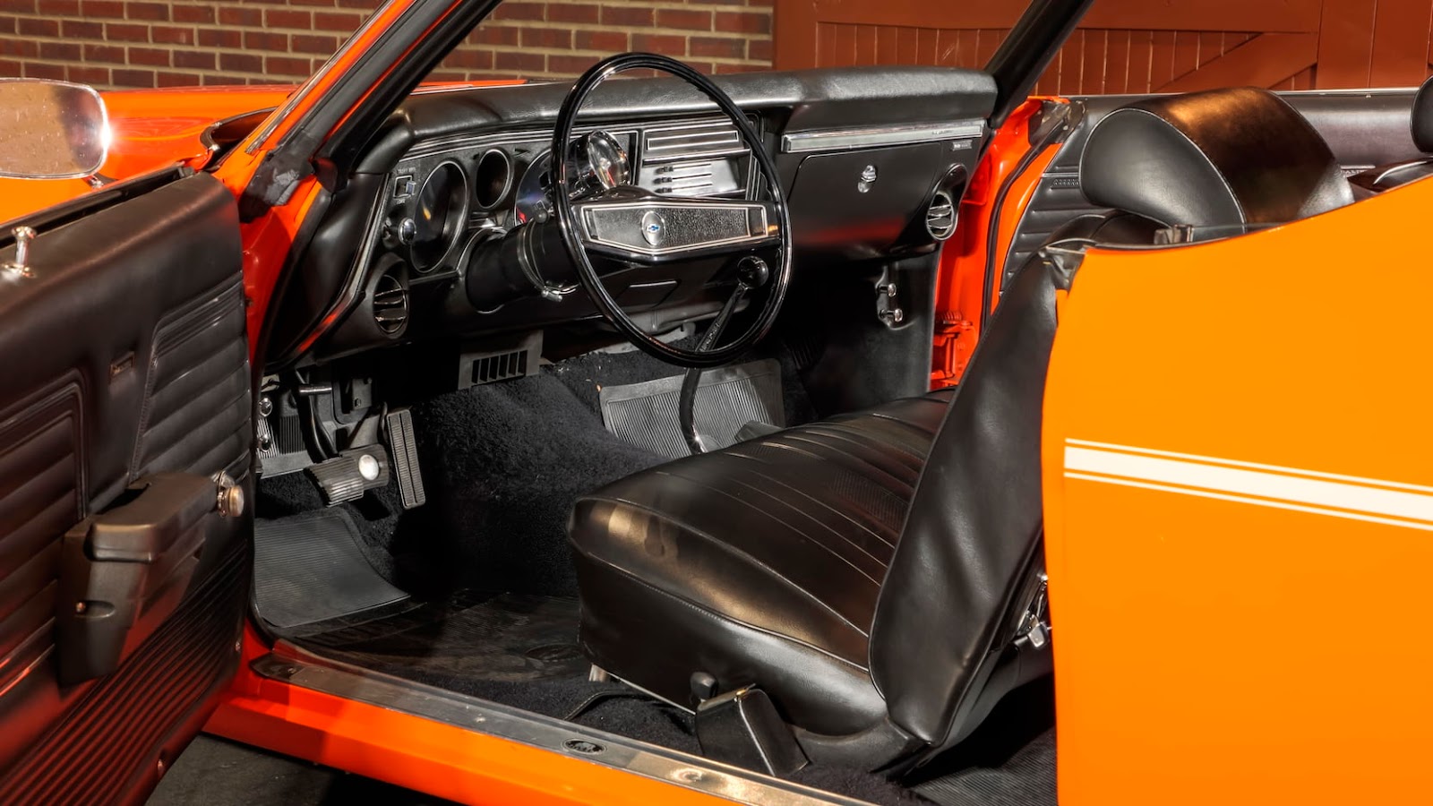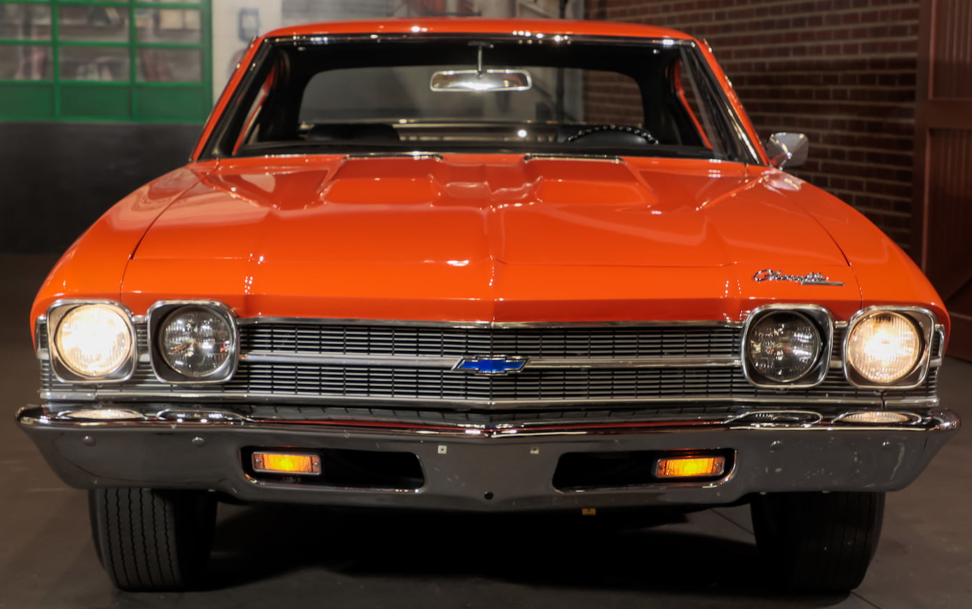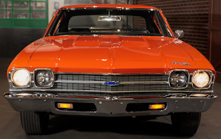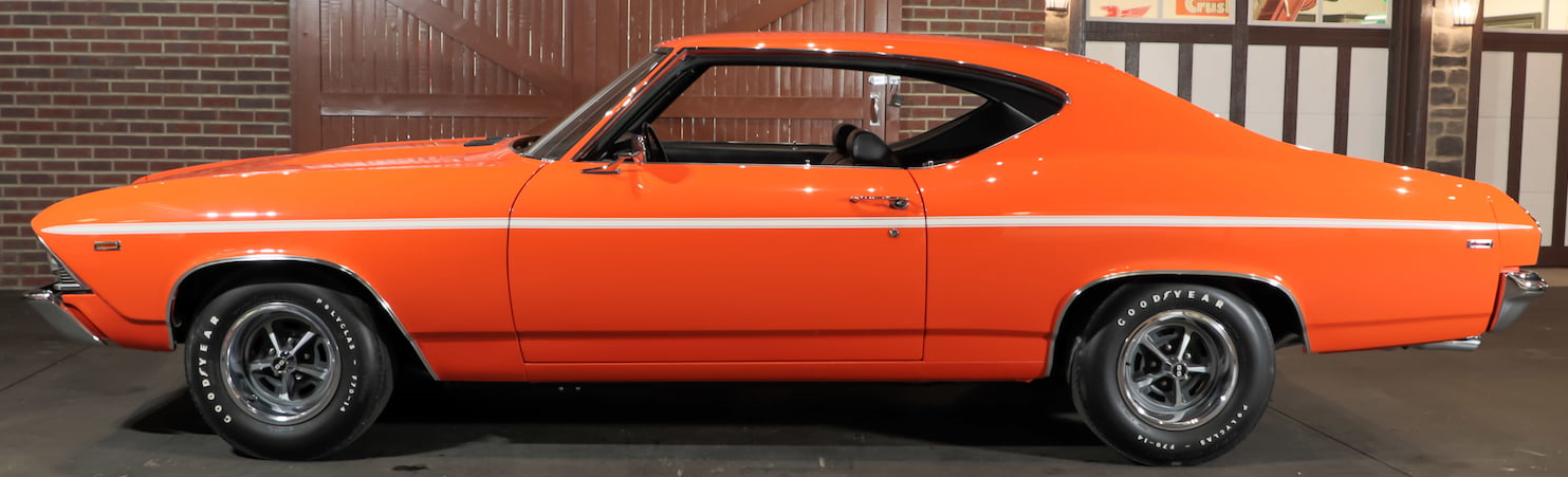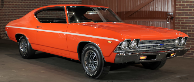 ![]() | One of only three COPO Chevelles produced in special-order Hugger Orange for Canadian market in 1969. The only example equipped with 4-speed manual transmission. Frame-off rotisserie restoration using many NOS parts. Original GM sheet metal. COPO 9566 427/425 HP L72 V-8 engine. Gardner exhaust. Muncie M22 Rock Crusher 4-speed transmission. 4.10 Positraction differential. Vacuum-assisted power brakes with front discs. Hugger Orange with White longitudinal side striping. Black bench seat interior. SS wheels. |