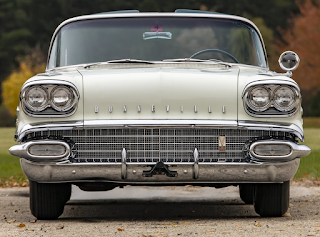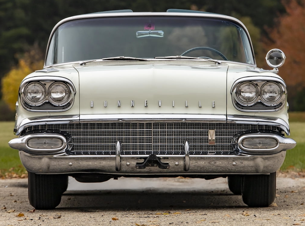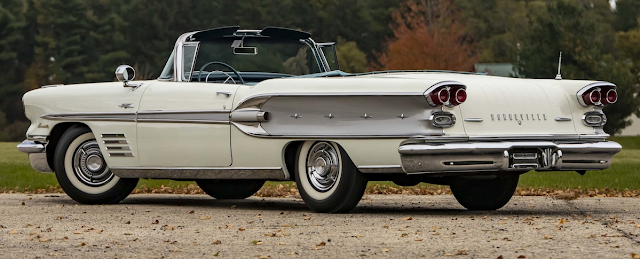 ![]() | The latest Mecum auction is underway and top lot thus far is a 1958 Pontiac Bonneville Convertible that made $91k against an estimate of $75k to $100k. Unrestored. Original paint. Original interior. 19,520 original miles. 370/300 HP Tri-Power V-8 engine. Automatic transmission. Power steering and brakes. Single spotlight. Code VVW Patina White and Starmist Silver paint. Mallard Turquoise/Marlin Turquoise leather interior. |
